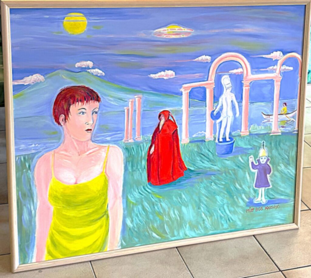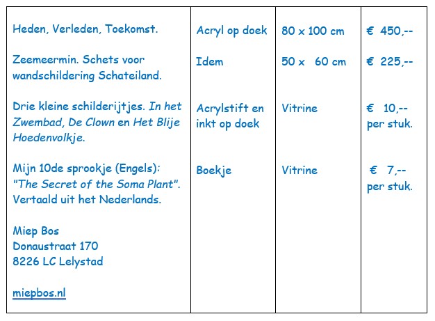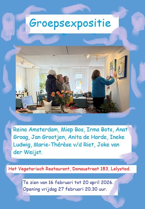 16-02-2026 Twee van mijn grotere schilderijen en drie kleinere (vitrine) hangen/liggen bij de groepsexpositie in Het Vegetarisch Restaurant in Lelystad. Ook mijn 10de sprookje in het Engels is daar te koop.