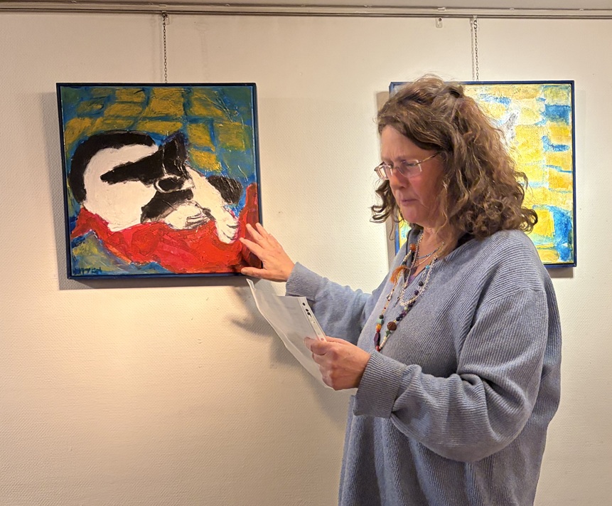 Marie-Thérèse van der Riet (Kunstkring Lelystad) legt haar schilderijen uit.