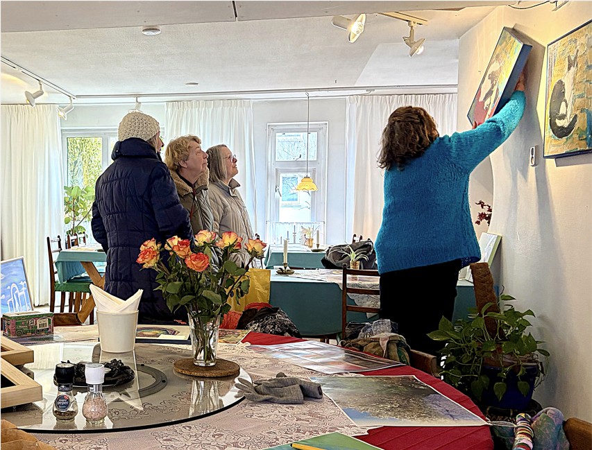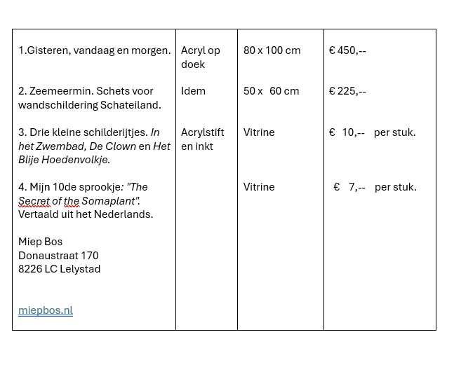16-02-2026 Twee van mijn grotere schilderijen en drie kleinere (vitrine) hangen/liggen bij de groepsexpositie in het Guus Veg Rest (Vegetarische Restaurant) in Lelystad. Ook mijn 10de sprookje in het Engels is daar te koop.