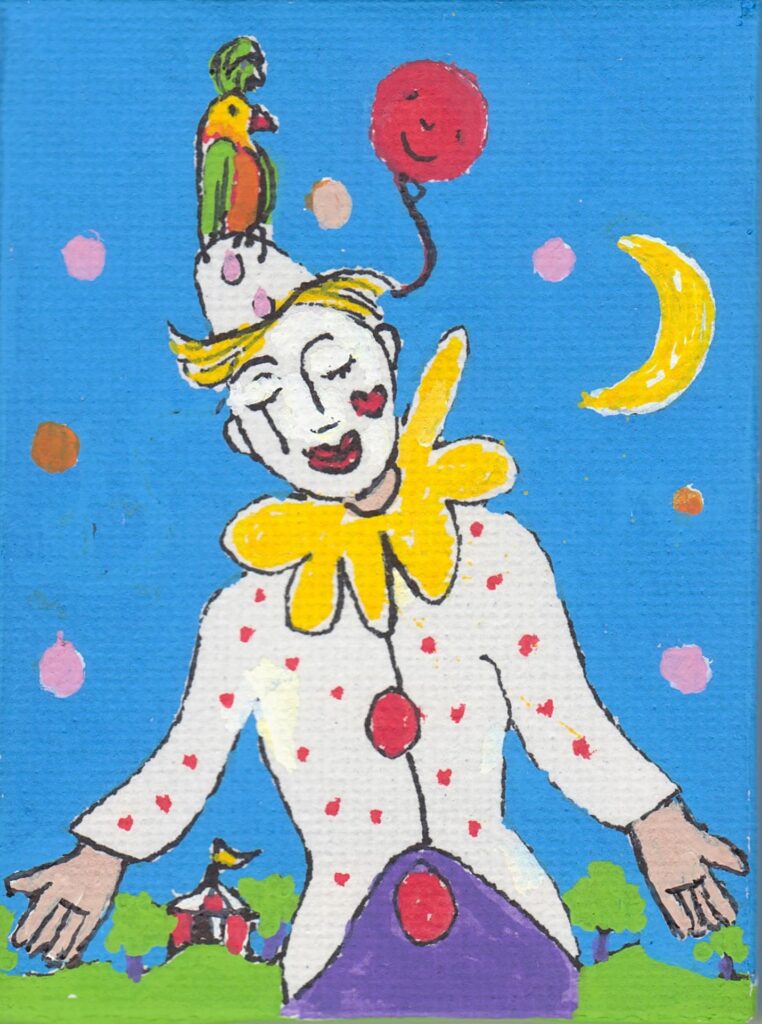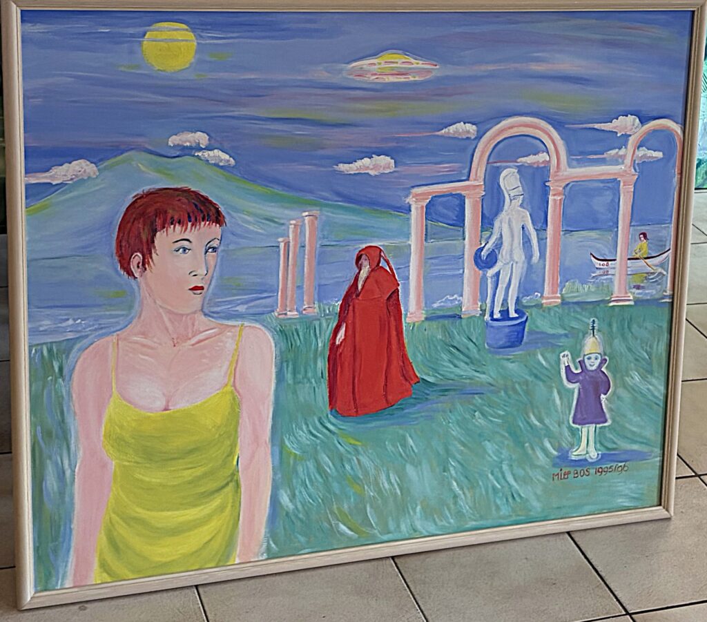 16-02-2026 Twee van mijn grotere schilderijen en drie kleinere (vitrine) hangen/liggen bij de groepsexpositie in het (Guus, Vegetarische Restaurant) in Lelystad. Ook mijn 10de sprookje in het Engels is daar te koop.